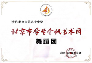 八十中學(xué)金帆舞蹈團(tuán)成立于2004年,2011年評(píng)為“金帆舞蹈團(tuán)”,現(xiàn)有團(tuán)員40余人。成立以來(lái)連續(xù)九屆獲北京市學(xué)生藝術(shù)節(jié)舞蹈比賽一等獎(jiǎng);2019年4月,舞蹈團(tuán)赴蘇州參加全國(guó)第六屆中小學(xué)生藝術(shù)展演,原創(chuàng)作品《青春驪歌》榮獲舞蹈類(lèi)一等獎(jiǎng);曾連續(xù)兩屆獲北京市舞蹈比賽一等獎(jiǎng),連續(xù)兩屆獲中國(guó)舞蹈家協(xié)會(huì)舉辦的“荷花·少年”全國(guó)舞蹈校園舞蹈匯演金獎(jiǎng),曾獲一屆華北五省舞蹈大賽一等獎(jiǎng),連續(xù)四年登上北京電視臺(tái)春晚,連續(xù)四年舉辦舞蹈專(zhuān)場(chǎng)——《時(shí)光》、《金帆情》、《夢(mèng)想帶我去遠(yuǎn)航》、《匆匆十年》,創(chuàng)作了20余支優(yōu)秀的校園舞蹈作品。代表作有《中學(xué)時(shí)光》、《借我一雙翅膀》、《紅》、《呼·吸》、《書(shū)山搏夢(mèng)》、《青春驪歌》等。