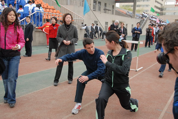 現(xiàn)任世界田聯(lián)主席、時(shí)任倫敦奧運(yùn)會(huì)組委會(huì)主席塞巴斯蒂安科指導(dǎo)金奧運(yùn)動(dòng)隊(duì)學(xué)生訓(xùn)練