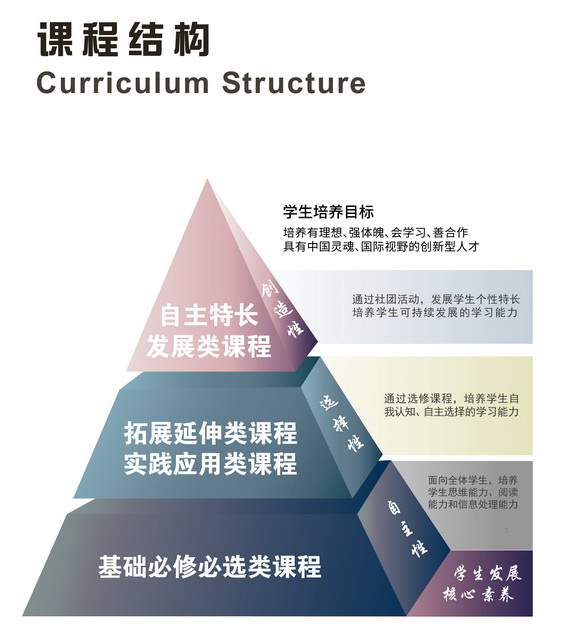 八十中學(xué)課程結(jié)構(gòu)堅(jiān)持以培養(yǎng)“有理想、強(qiáng)體魄、會(huì)學(xué)習(xí)、善合作的具有中國(guó)靈魂和國(guó)際視野的創(chuàng)新型人才”的育人目標(biāo)為課程設(shè)計(jì)的出發(fā)點(diǎn)和歸宿點(diǎn),依據(jù)“以人為本、多元開(kāi)放、自主選擇”的原則,體現(xiàn)出三級(jí)立體分層的課程結(jié)構(gòu)特點(diǎn),著力于不同學(xué)生興趣潛質(zhì)需求,著力于學(xué)生全面而個(gè)性發(fā)展。立體三級(jí)課程以面向全體的基礎(chǔ)必修必選課程為起點(diǎn),同時(shí)加強(qiáng)綜合拓展選修課程的豐富性和選擇性,并關(guān)注學(xué)生自主發(fā)展,以學(xué)生發(fā)現(xiàn)自己、形成個(gè)性特長(zhǎng)的自主發(fā)展課程為高點(diǎn)目標(biāo)設(shè)計(jì)。