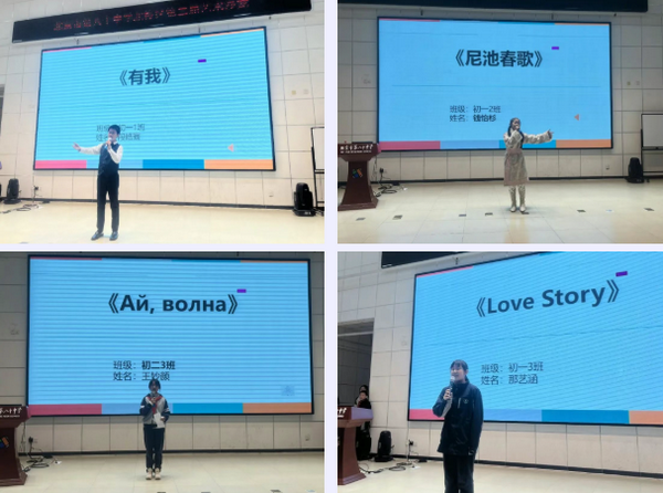 活動(dòng)首日,以歌唱專場(chǎng)率先拉開(kāi)帷幕。舞臺(tái)上同學(xué)們以飽滿的熱情獻(xiàn)上了一場(chǎng)視聽(tīng)盛宴。旋律浪漫的國(guó)語(yǔ)歌曲,節(jié)奏輕快的英語(yǔ)歌,充滿遐想的俄語(yǔ)歌。最后一首來(lái)自初二年級(jí)的合唱曲目《手心的薔薇》將氛圍推向高潮。悠揚(yáng)的歌聲回蕩在校園上空。