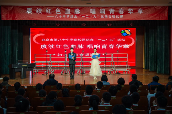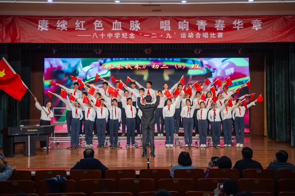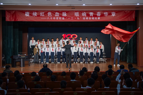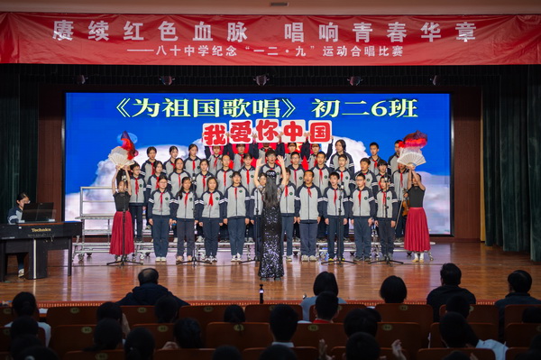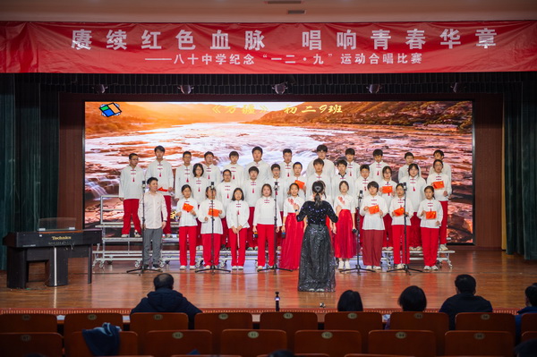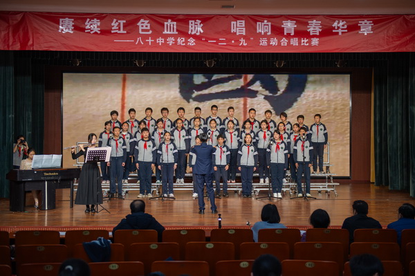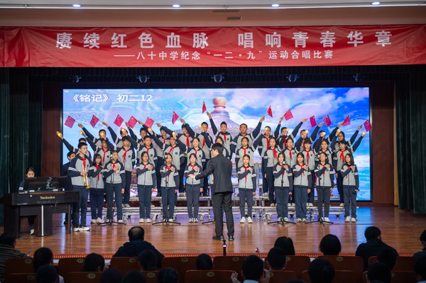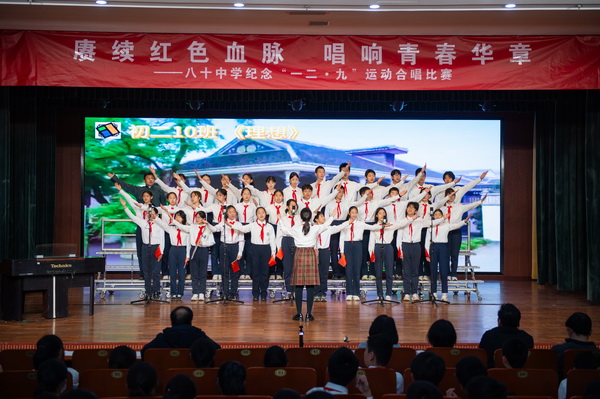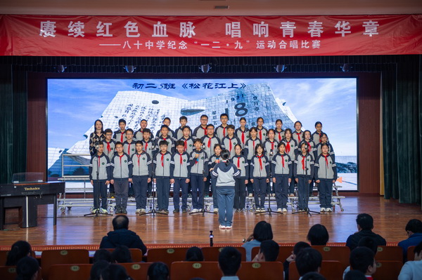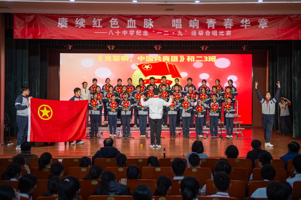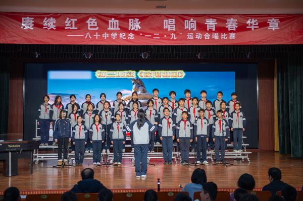2025年12月25日,北京市第八十中學南校區(qū)初二年級成功舉辦了以“賡續(xù)紅色血脈,唱響青春華章”為主題的紀念“一二·九”運動合唱比賽。一首首激昂澎湃的紅色經(jīng)典歌曲在校園中久久回蕩,既為同學們搭建了展現(xiàn)青春風采的廣闊舞臺,更以悠揚歌聲回望崢嶸歲月、傳承紅色基因,為同學們上了一堂生動深刻、浸潤心靈的愛國主義教育課。校領(lǐng)導及各部門主任蒞臨現(xiàn)場,與全體師生一同見證這場浸潤著信仰與青春的紅色盛宴。